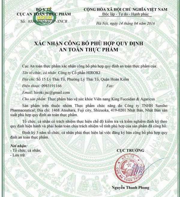 Giấy chứng nhận của sản phẩm King Fucoidan & Agaricus