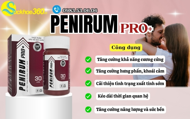 Penirum Pro+ là một thực phẩm chức năng hỗ trợ tăng cường sinh lý nam giới, được bào chế từ các thành phần tự nhiên và hướng đến việc cải thiện nhiều khía cạnh của sức khỏe tình dục. Sản phẩm này có thể là một “trợ thủ” đắc lực cho những người đang tìm kiếm giải pháp để cải thiện ham muốn, khả năng cương cứng, sức bền và sự tự tin.