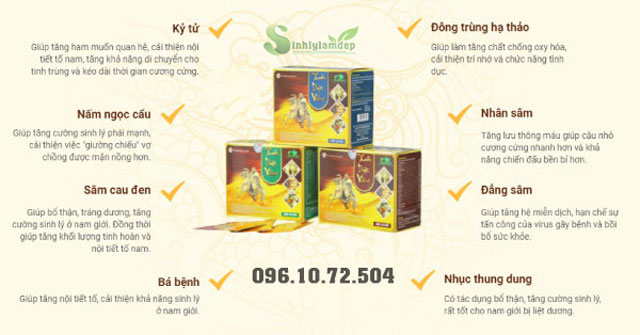 Các thành phần của sản phẩm giúp thẩm thấu rất nhanh và sâu tới tận tế bào, nâng cao chất lượng cuộc sống và những vấn đề về sức khoẻ hiệu quả. Sản phẩm được chia thành 3 liệu trình sử dụng khác nhau thích hợp với từng tình trạng bệnh mà phái mạnh đang gặp phải.